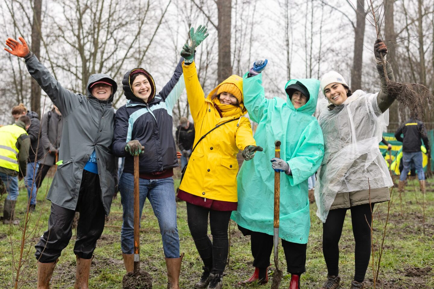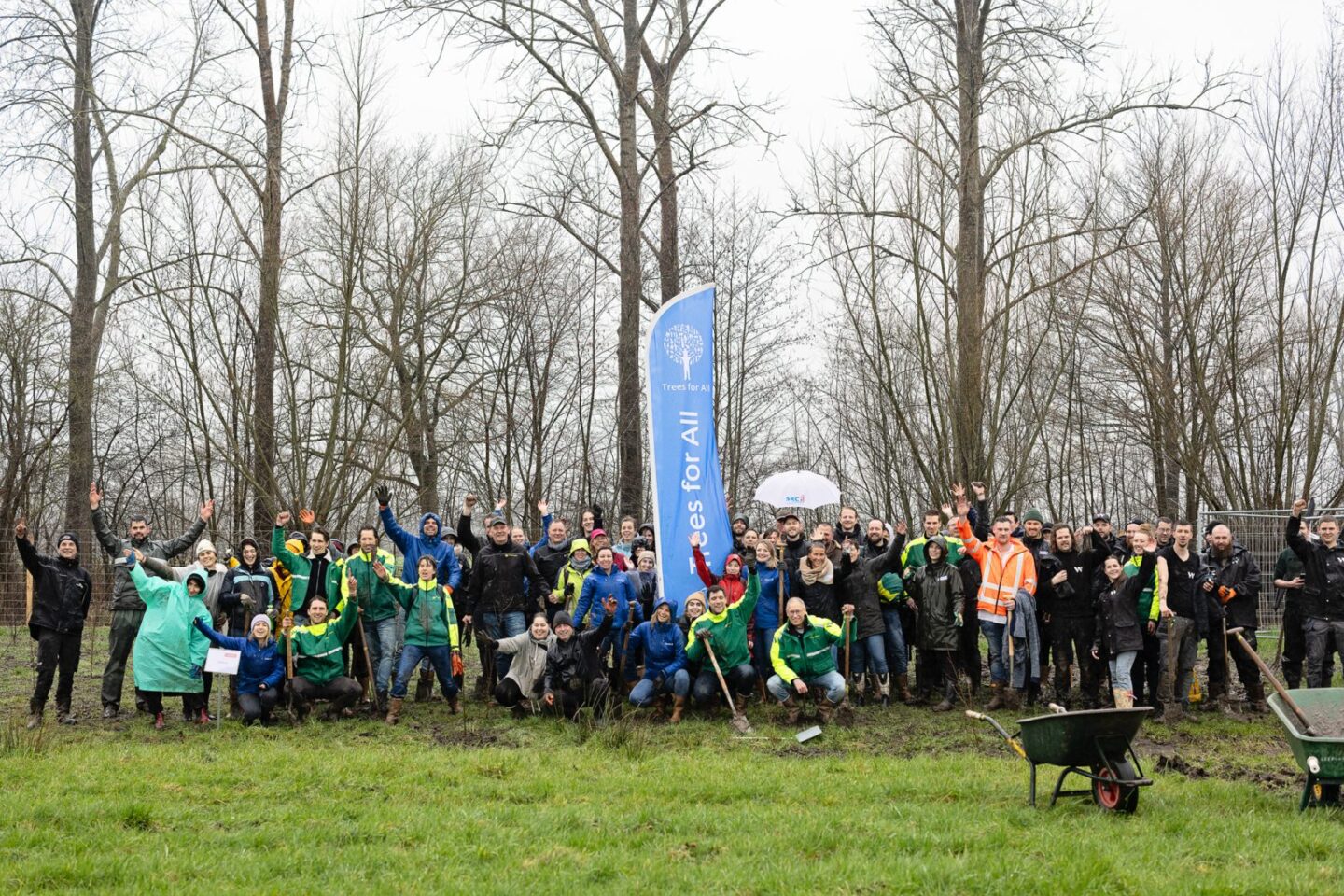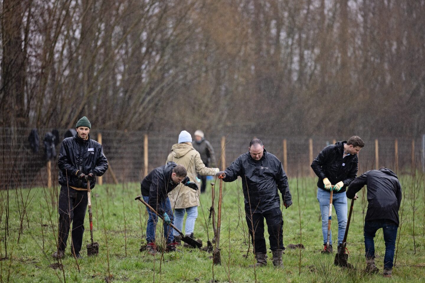 Op een regenachtige plantdag op 29 februari 2024 zetten onze donateurs boompjes in de grond