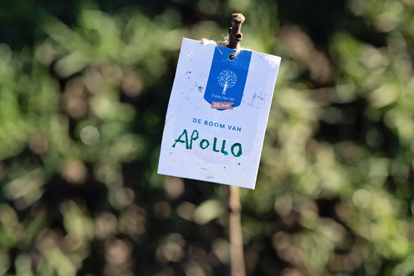 Extra bijzonder was dat donateurs een boom op naam konden planten in dit Jubileumbos. Of het nu voor henzelf was, voor (klein)kinderen, een geliefde, dierbare vrienden of collega’s – elke boom werd een persoonlijke bijdrage aan een groenere wereld.