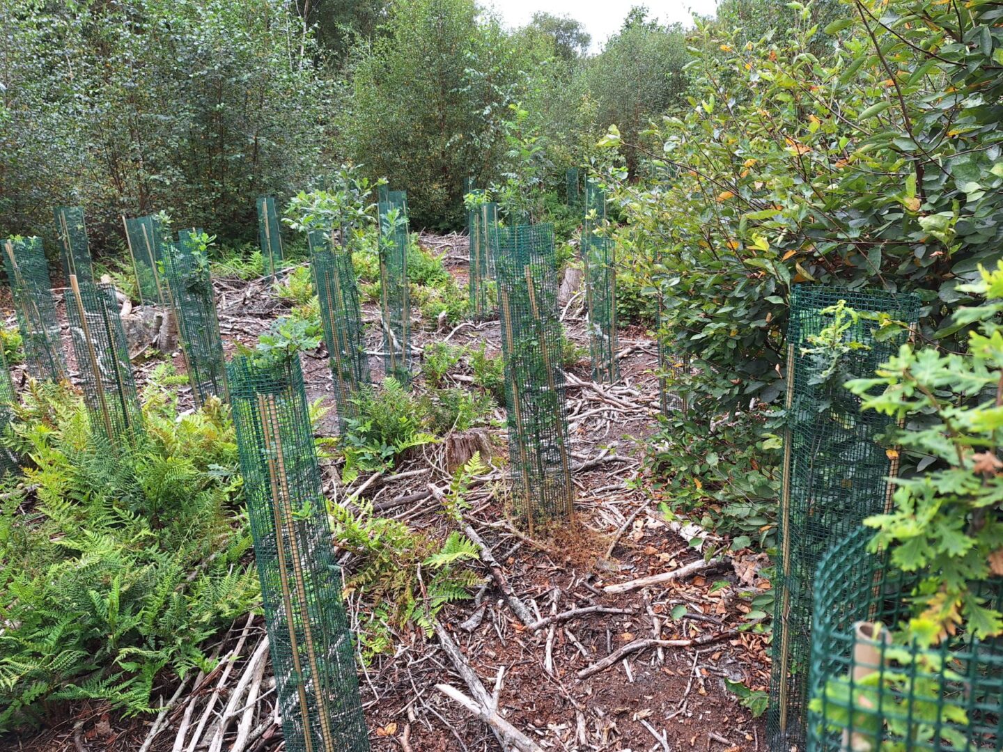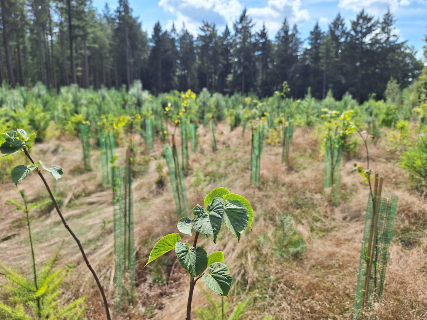 Thanks to the wet winter, the trees are growing excellently! More than 90% of the trees survived their first year and are now beautifully leafed out. The young trees are protected from being eaten by deer and other animals with tubes, allowing them to grow safely.