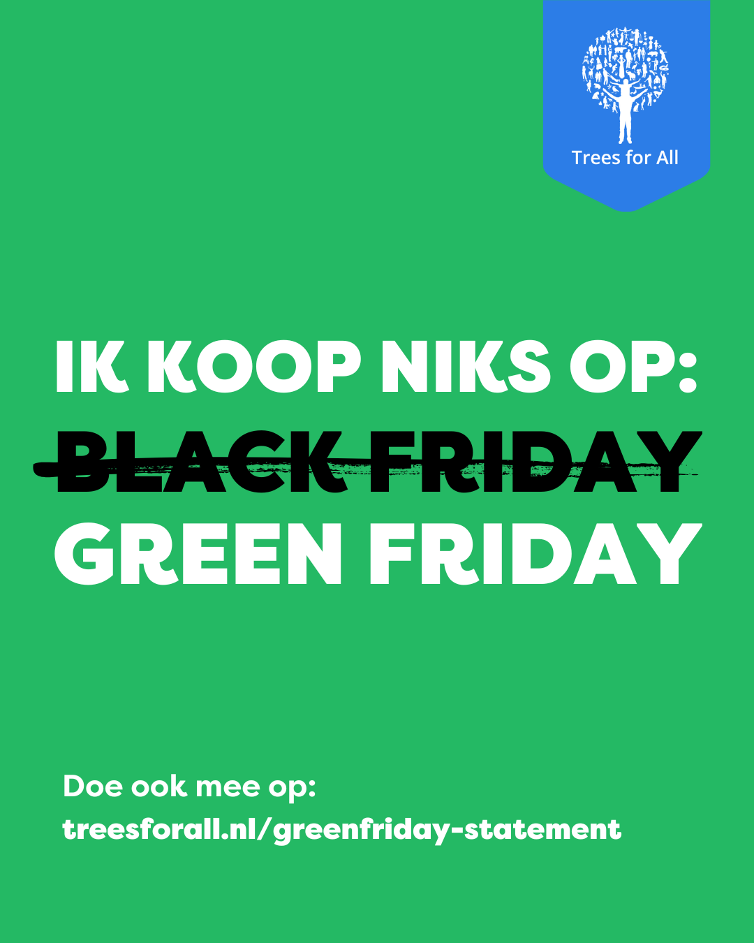 Met de Green Friday-beweging van Trees for All beloven bedrijven en consumenten om geen Black Friday-deals te (ver)kopen. Sluit jij je ook aan? Dan ben je goed bezig: voor de aarde én voor je portemonnee!