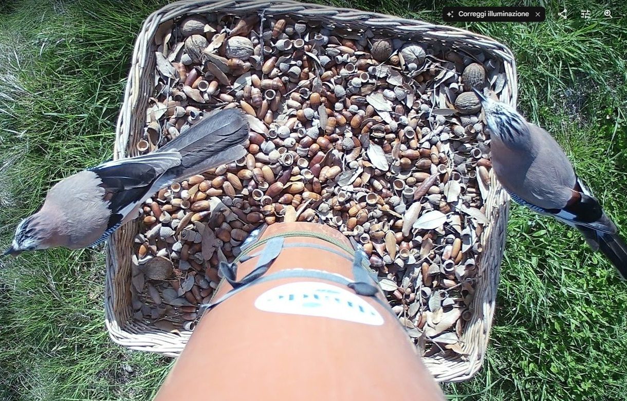 Verbrande delen in het natuurgebied en de voederboxen voor gaaien die bijdragen aan het bosherstel