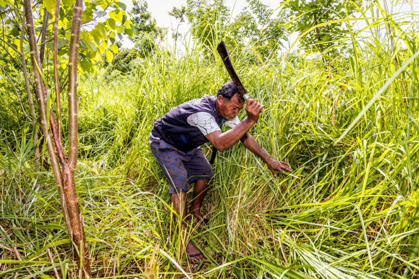 Van links naar rechts: mensen uit de regio helpen bij de aanplant van de bomen (foto 1), in de kwekerij (foto 2) en bij het verwijderen van het alang-alang-gras zodat de bomen de grond in kunnen (foto 3).