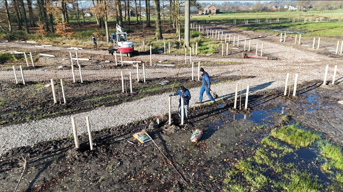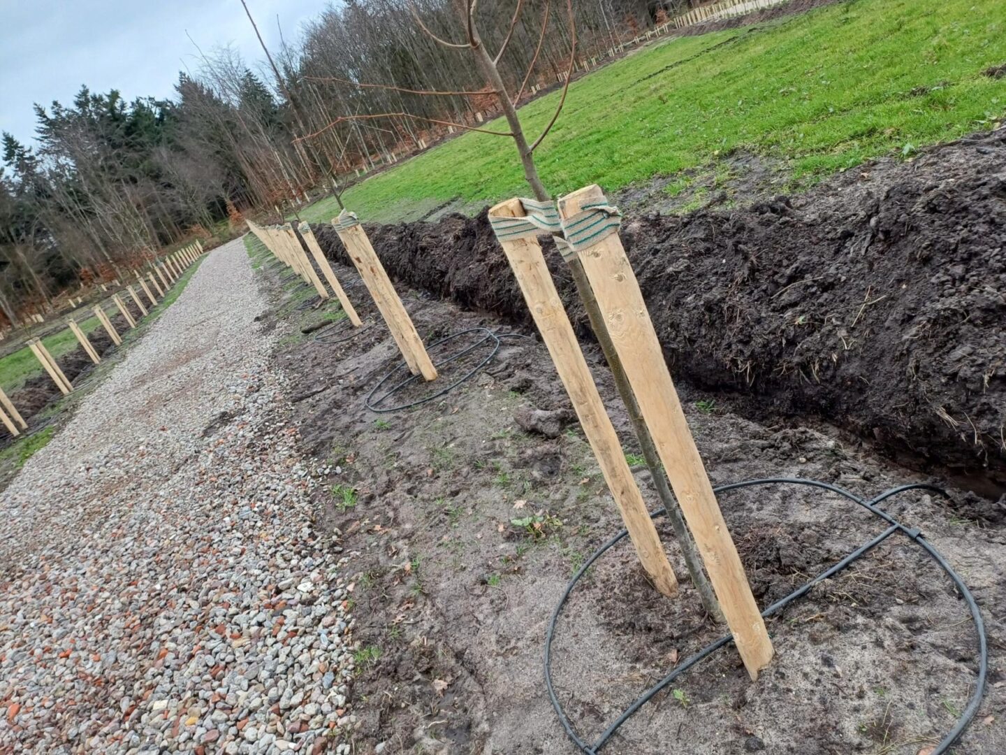 Samen met enthousiaste partners van Hotels for Trees plantten we tijdens een plantdag honderden bomen en struiken in de bosvakken tussen de laanbomen. Ook deze bomen staan er heel goed bij en komen nu boven onkruid uit. Om vraat door reeën tegen te gaan, zijn stammen ingewreven met schapenwol – een natuurlijke en effectieve bescherming. Dankzij deze aanpak is de uitval minimaal gebleven.