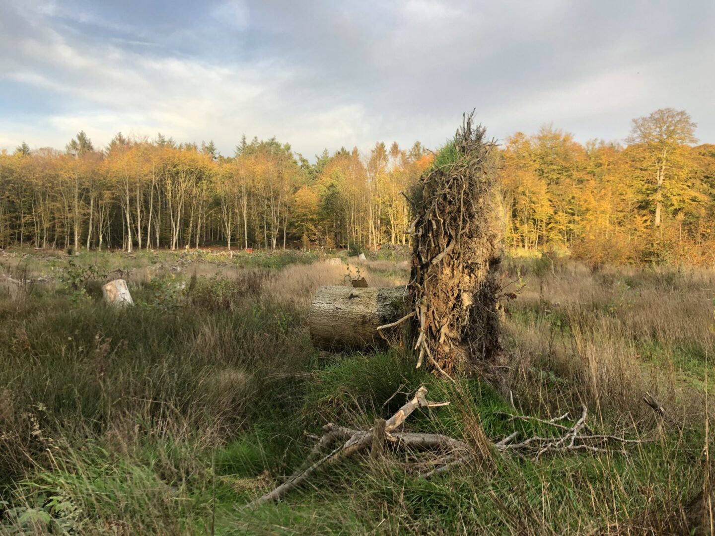 Omgewaaide bomen en schade aan het bos na de valwind in 2021