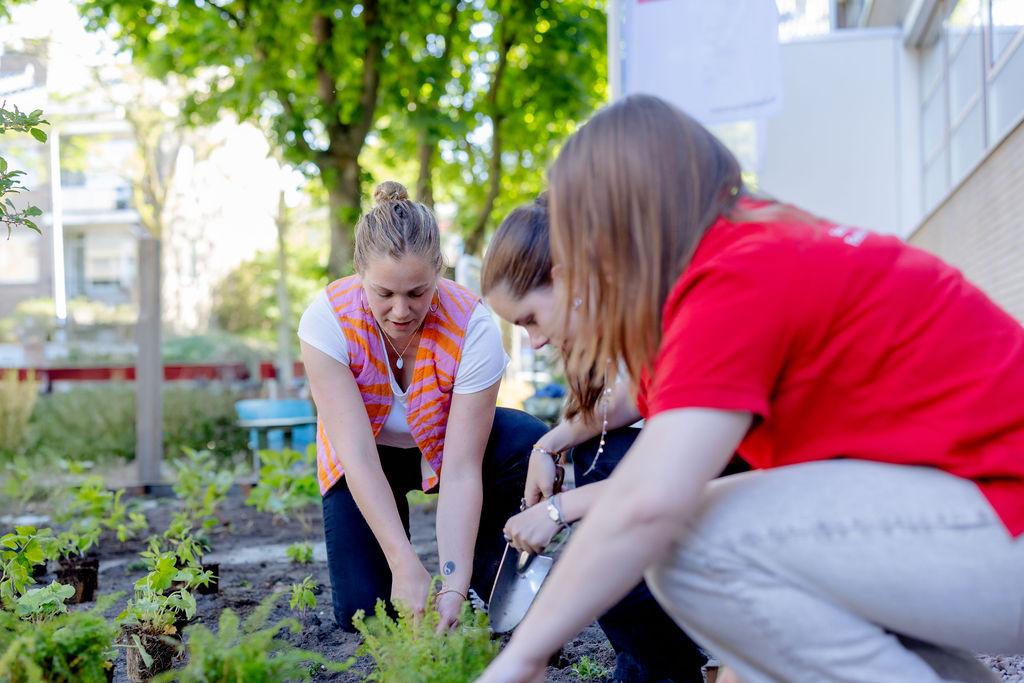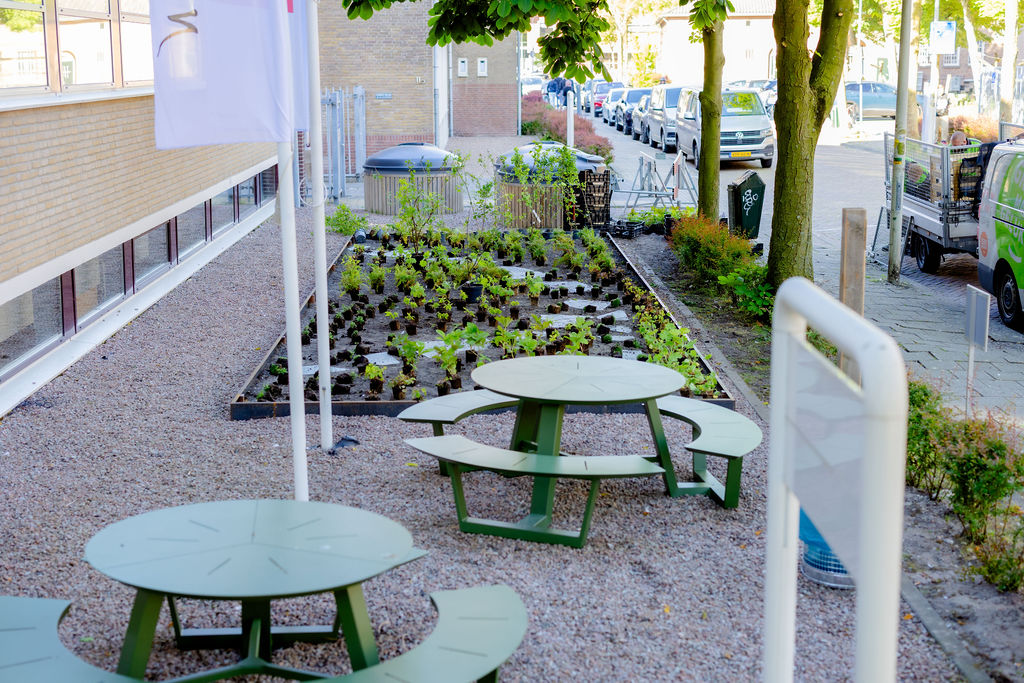 De grindstrook heeft inmiddels plaatsgemaakt voor een groene strook met heesters, planten, kruiden en zitplekken. Sylvie is trots op het eindresultaat: “We hebben niet alleen de school vergroend, maar ook een stukje van de wijk in Den Haag. Ik vind het mooi dat we op deze manier ook een beetje voor de buurt zorgen en bijdragen aan meer biodiversiteit en een gezonde omgeving.”